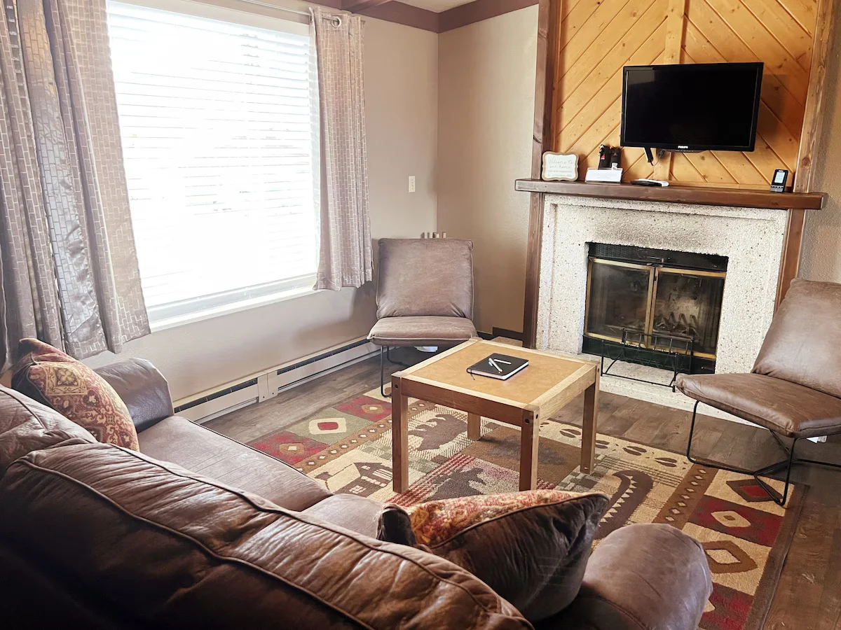 Unpack your clothes and unwind in the living room that features a leather couch, 2 club chairs, a wood-burning fireplace and a flat screen TV.